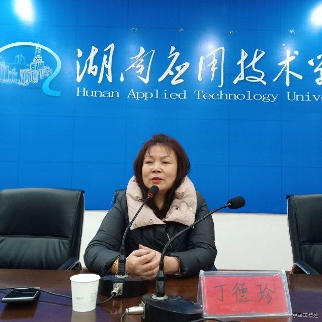 紧接着, 由学工处丁德珍副处长发言。首先介绍她负责的工作范围,然后她希望以前同学们内务做得好的继续发扬,做得不好的加以改正。提出“屋子不怕小,只要收拾得好”的言论。希望班长能起好带头作用,把班上的同学带领起来把内务整理好。