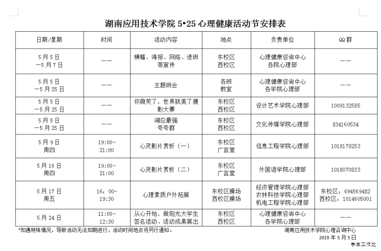 湖南应用技术学院5•25心理健康活动节安排表