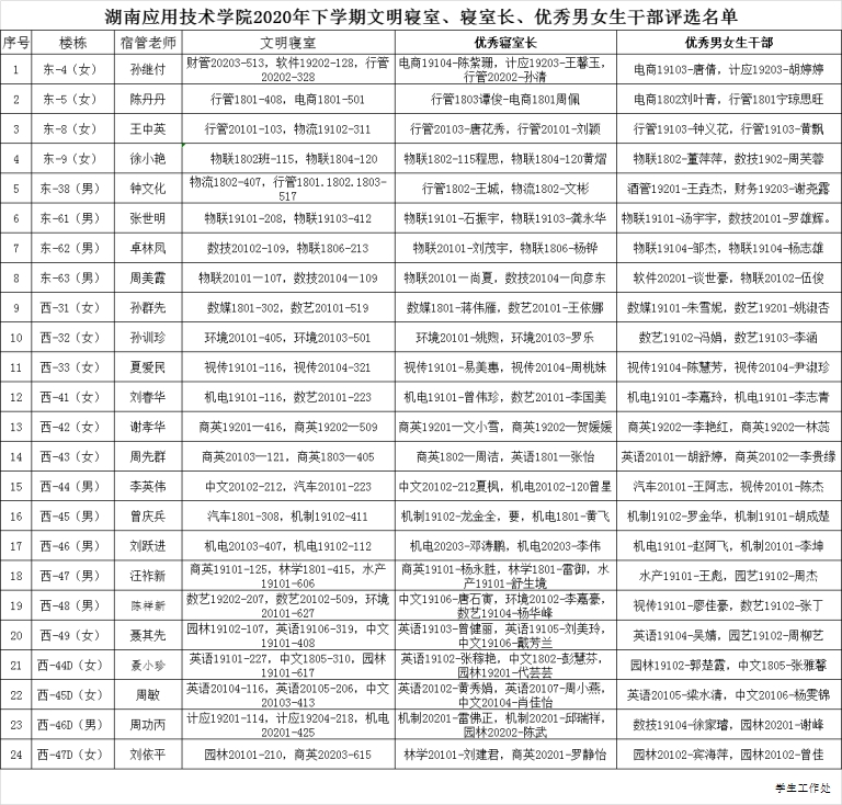 湖南应用技术学院2020年下学期文明寝室、寝室长、优秀男女生干部评选名单