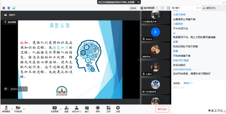 1月20日晚,我校心理健康教育系列云讲座之毕业生心理调适线上开讲,心理健康咨询中心教师刘敏主讲,200余名学生聆听。