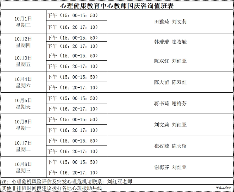 假期中,既有轻松欢乐的时刻,也可能会有想要倾诉的瞬间。无论你是想缓解假期里的情绪波动,还是需要梳理内心的迷茫,都可以拨通我们的热线,获得专业、便捷且及时的心理疏导,让每一种心绪都能得到温柔回应,每一段假期时光都能安然自在。具体心理热线服务安排如下: