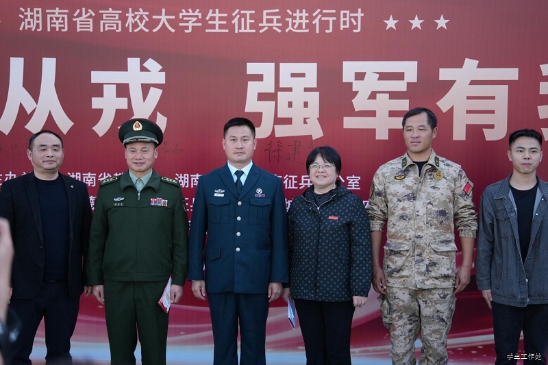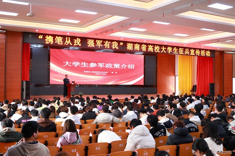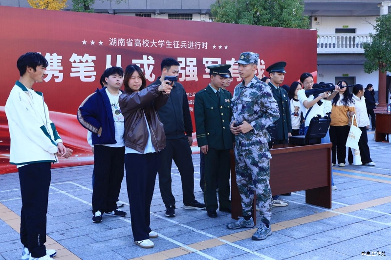 为深入发动湖南省高校大学生参军入伍,促进毕业生高质量就业,由湖南省教育厅、湖南省人民政府征兵办公室联合主办的“携笔从戎 强军有我”湖南省高校大学生征兵宣传活动,于2025年11月28日下午在我校顺利举行。常德市军分区动员处副处长张勇,常德市鼎城区人民武装部部长徐建新上校,我校党委委员、副校长丁春茹,武装部部长刘治国出席活动。活动分为室内宣讲与室外体验两个环节,分别在43D报告厅与28栋前坪同步开展,活动吸引3000余名学生参与。