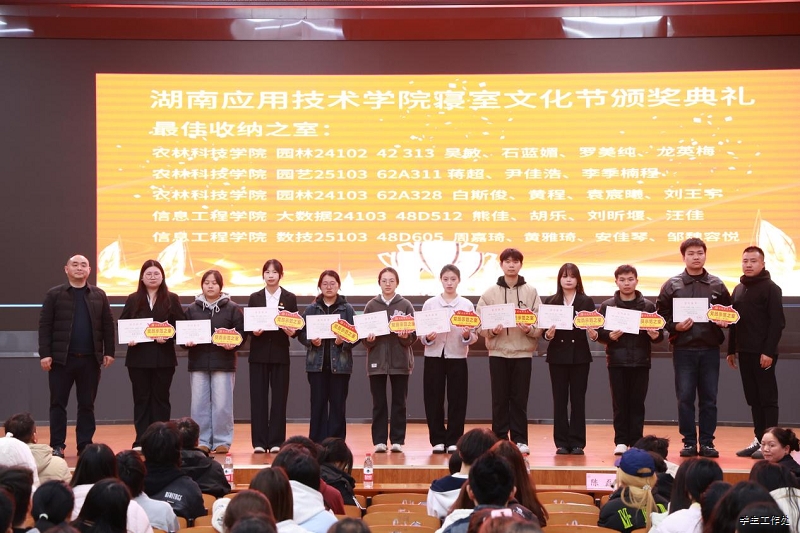 随后,范青宣读了表彰决定,对活动中涌现出的先进集体和优秀个人进行表彰。文化传媒学院、农林科技学院荣获“先进集体”称号;62D-433寝室等10间寝室获评“党员示范之室”,42-313寝室等20间寝室获评“最佳收纳之室”,48D-514寝室等10间寝室获评“书香之室”,44D-607寝室等10间寝室获评“创意之室”;赵逸萱等35名同学被评为“优秀寝室长”;丁满平等20名宿管员及学生自律委员会干部获评“公寓管理服务先进个人”。