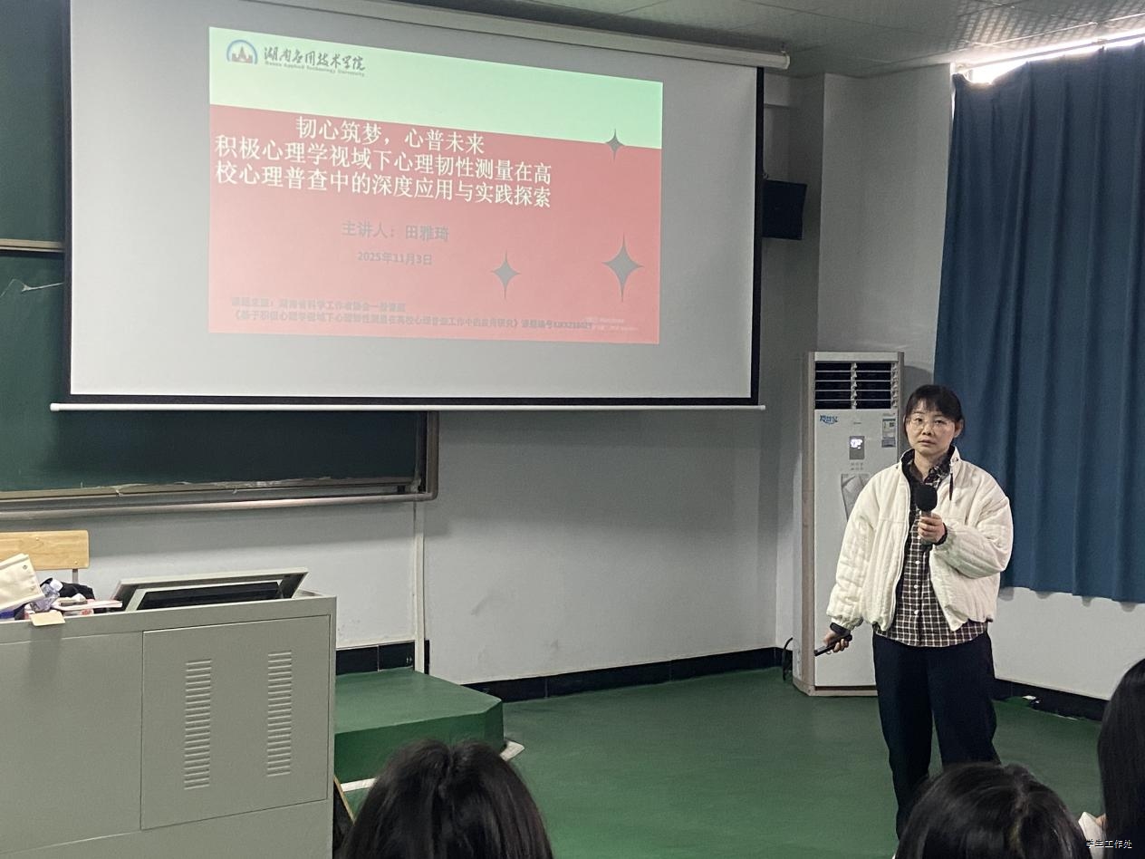 11月3日,由湖南省科学工作者协会资助课题《基于积极心理学视域下心理韧性测量在高校心理普查工作中的应用研究》项目组主办的“韧心筑梦,心普未来”专题讲座在我校A4-306成功举行。课题组田雅琦老师担任主讲,学院辅导员、心理工作专职教师及学生代表共同参与。