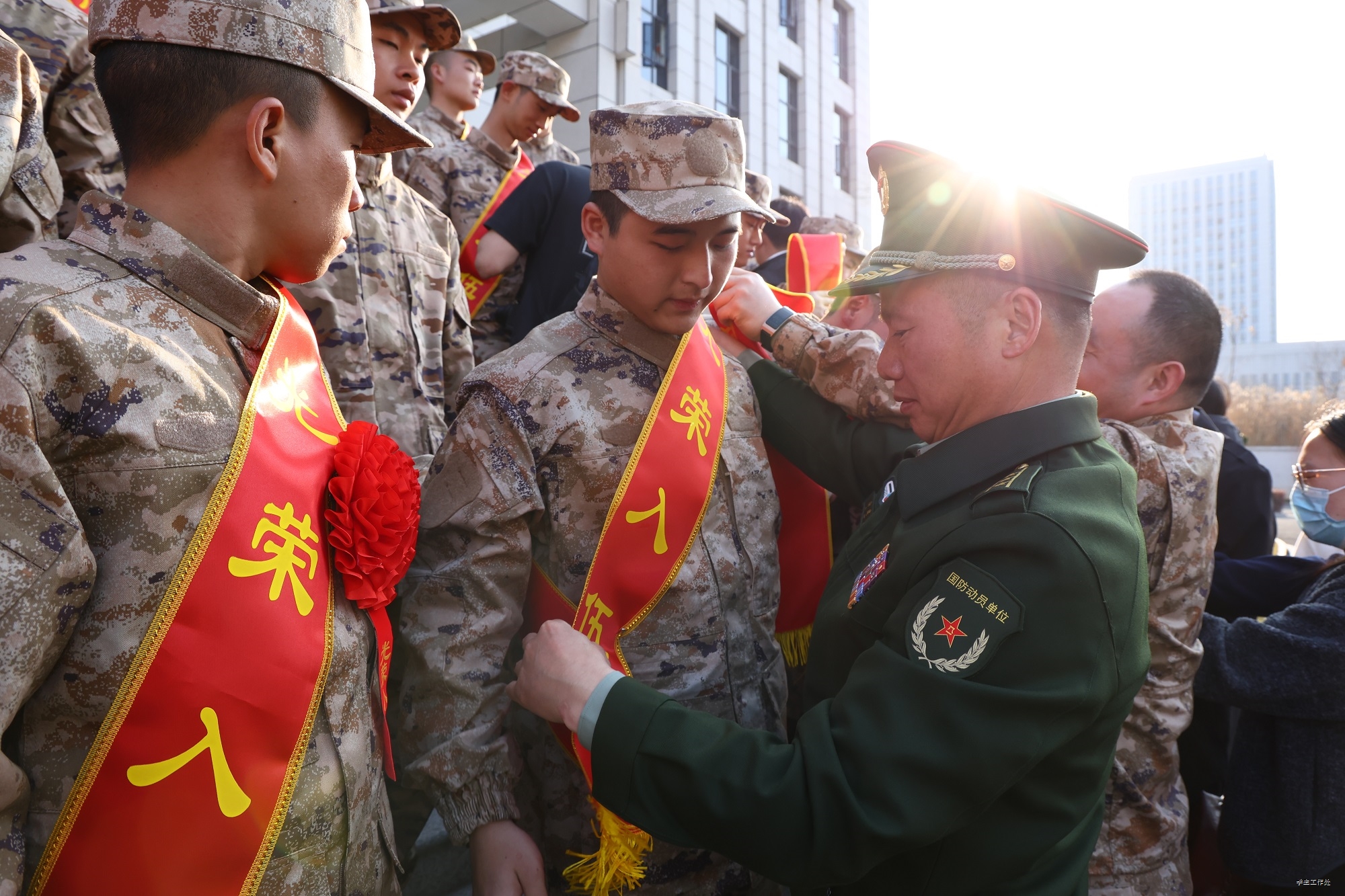 欢送仪式由丁春茹主持。与会领导与辅导员、家长亲手为新兵佩戴光荣绶带和红花,将家乡人民的嘱托系在每位新兵胸前。