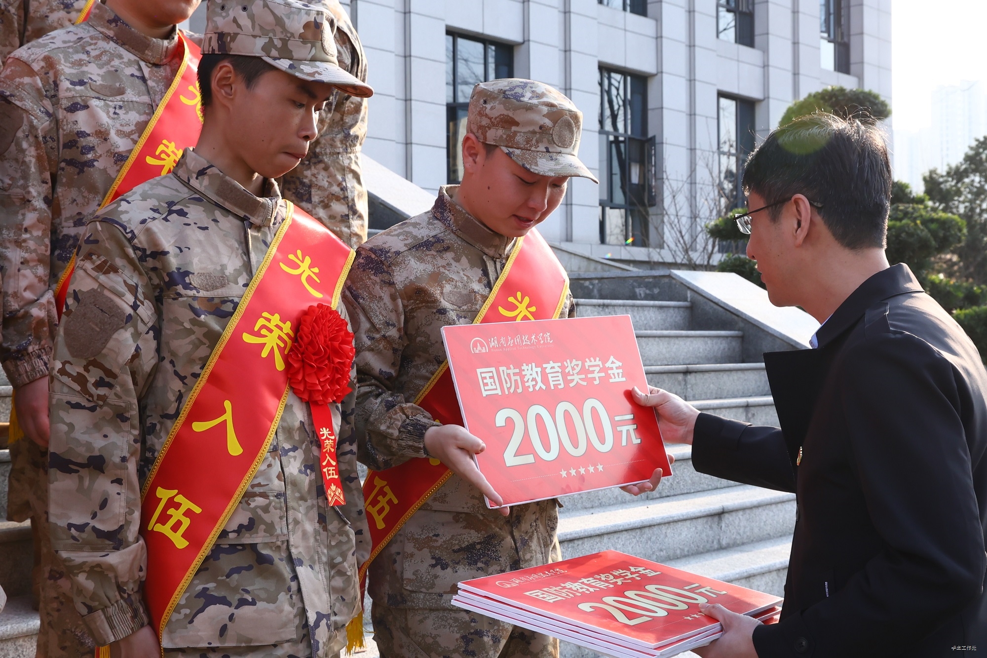 为激励广大学子投身国防事业,学校为每位入伍新兵颁发2000元“湖应国防教育奖学金”。这一举措不仅为入伍学生提供了物质鼓励,更与国家优抚政策形成合力,进一步完善了从选拔、培养到激励、保障的全链条育人体系。