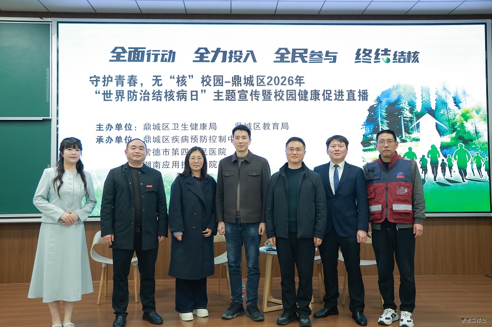 3月23日晚,由鼎城区卫生健康局、鼎城区教育局联合主办,我校与鼎城区疾病预防控制中心、常德市第四人民医院共同承办的“守护青春,无‘核’校园”——鼎城区2026年“世界防治结核病日”主题宣传暨校园健康促进直播活动于9D-223报告厅顺利举行。活动吸引线上线下广泛关注,直播累计观看达7.9万人次。