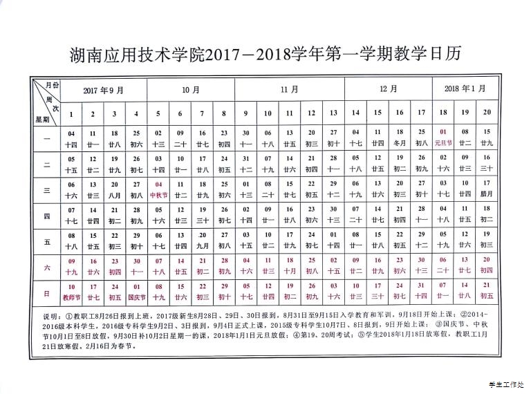 湖南应用技术学院2017-2018学年第一学期教学日历